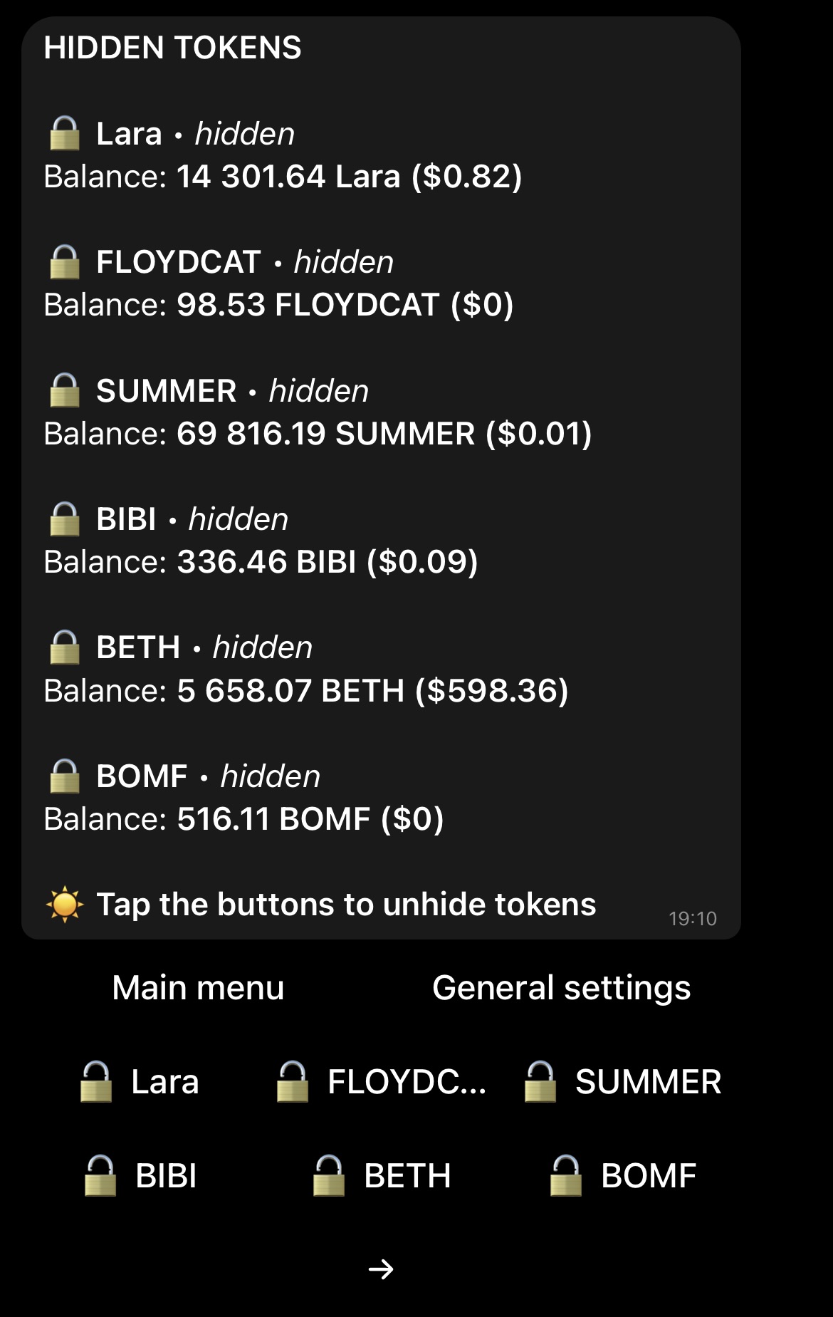 <figure><img src="https://2627268705-files.gitbook.io/~/files/v0/b/gitbook-x-prod.appspot.com/o/spaces%2FumSyE9WykGJ26zxqcqEc%2Fuploads%2FrPv2jfC7EBxBCLsypPqN%2FC4FA3D0F-8DD9-4E30-9335-9A121DED8CE2_4_5005_c.jpeg?alt=media&#x26;token=6df9835a-754d-414b-83b4-62a8b143afba" alt="" width="375"><figcaption><p>Unhide token message</p></figcaption></figure>